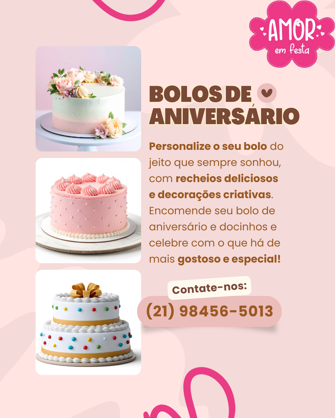 Na Amor em Festa, cada detalhe é pensado para transformar sua comemoração em um momento especial. Oferecemos sabor, cuidado, praticidade e um atendimento atencioso para você celebrar sem preocupações.